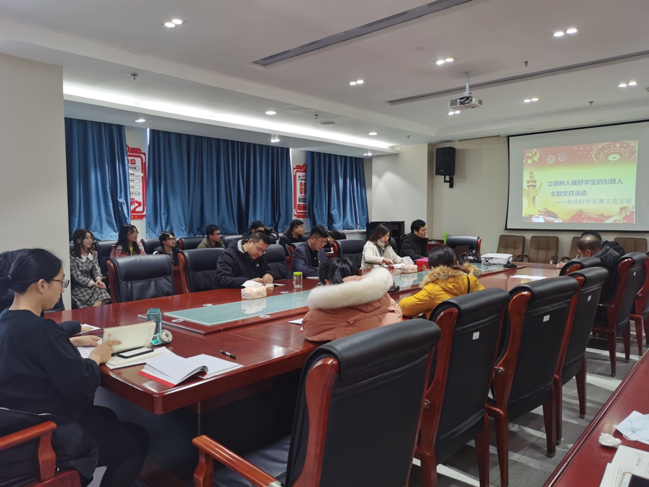 科技楼A410会议室开展了教师党员与学生党员联合“立德树人做好学生的引路人”主题党日活动,会议由食品科学系教工党支部书记张惠玲主持,食品与葡萄酒学院党委书记张宁、副院长方海田出席,食品科学系教师党员以及食品科学系研究生党员代表8人、本科生党员代表5人参加。