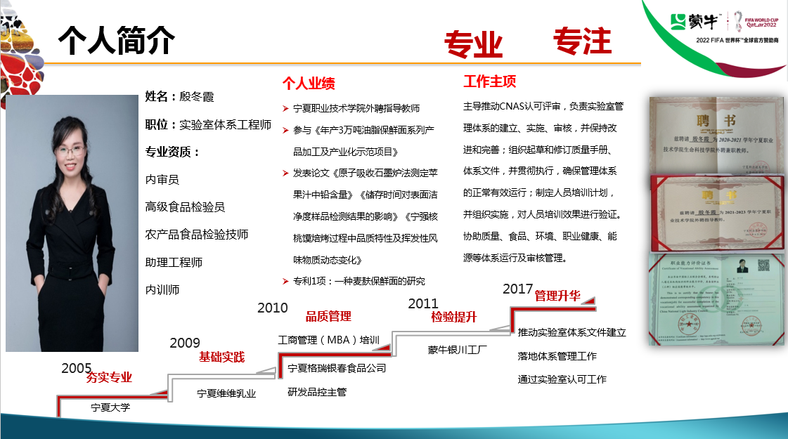 殷冬霞老师是蒙牛特仑苏(银川)乳业有限公司的实验室体系工程师,具有内审员、高级食品检验员、农产品食品检验技师、内训师等职业资格证书,有着丰富的企业质量管理、内审和员工培训经验,也是我们萝莉社 食品科学与工程专业的优秀校友。