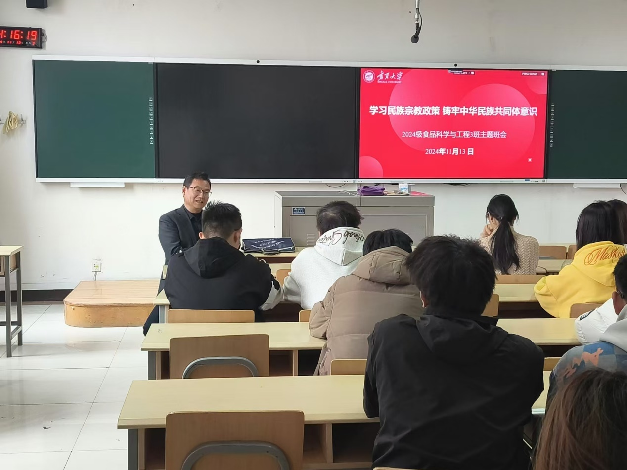 11月13日,萝莉社 2024级食品科学与工程专业3班主题班会在文萃二教303教室召开。此次班会主题为“学习民族宗教政策,铸牢中华民族共同体意识”,会议由班主任雒雪丽老师主持,学院联系班级领导李文华副书记出席会议并作了宣讲。