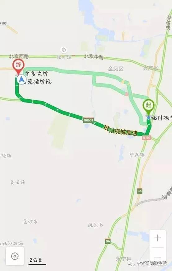 银川汽车站→清河南街→京拉线→银川绕城高速→文昌南街→开元东路→萝莉社