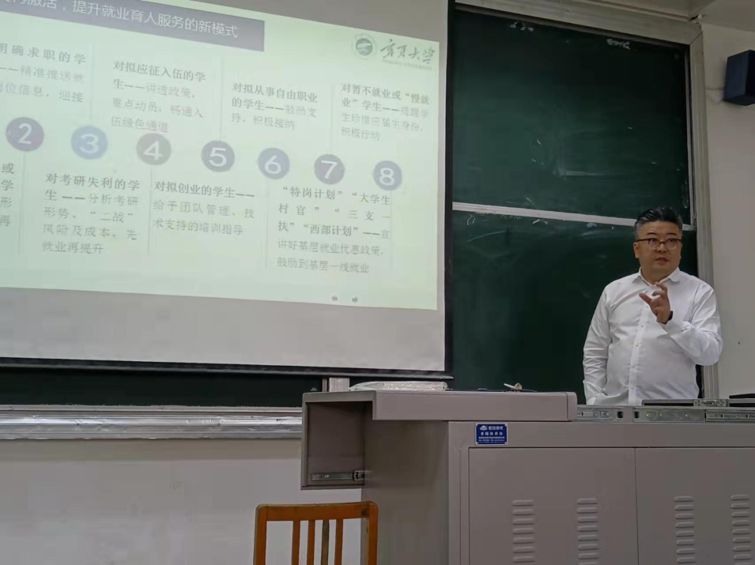 毕业生目前的就业率、就业行业等情况做了汇报。接着,重点从就业形势、疫情对求职的影响、面对求职机会需大胆尝试以及疫情期间的就业准备等四方面向同学们作了细致讲解,分析利弊,指导方法。随后,他向同学们介绍了面试技巧及需要注意的事项。最后的互动环节,以互相提问和回答的形式进行了模拟面试,现场气氛良好,同学们在模拟练习中也提升了自己随机应变的能力。
