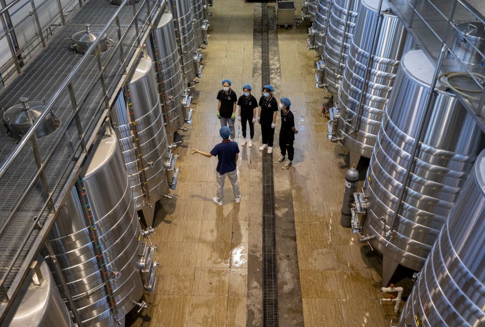 食品与葡萄酒学院葡萄系的学生在向酒庄工作人员(前)学习车间生产知识(7月8日摄)。