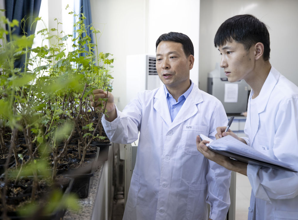 食品与葡萄酒学院葡萄系的葡萄抗逆分子育种实验室内,教师(左)指导研究生开展低温胁迫后的葡萄表型观察与分析试验(7月8日摄)。