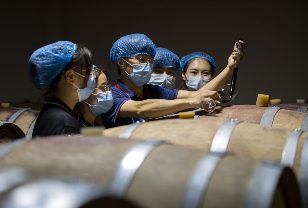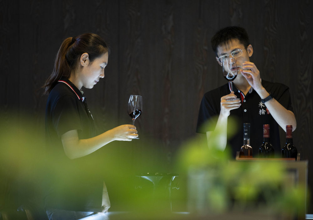 食品与葡萄酒学院葡萄系的学生一同品尝葡萄酒(7月8日摄)。