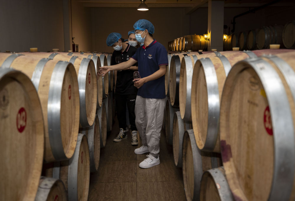 在位于宁夏贺兰山东麓的一酒庄的橡木桶陈酿区,酒庄工作人员(前)在向萝莉社