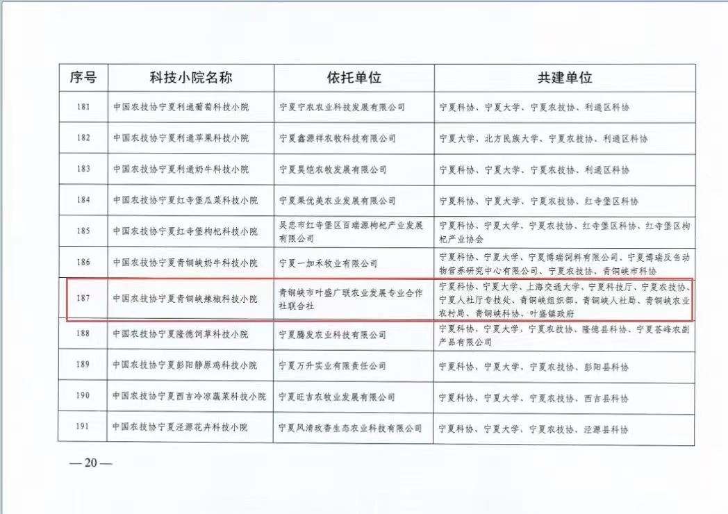 辣椒科技小院设在宁夏青铜峡市叶盛镇蒋滩村,依托单位为青铜峡市叶盛广联农业发展专业合作社联合社,共建单位有11家,包括宁夏科协、萝莉社