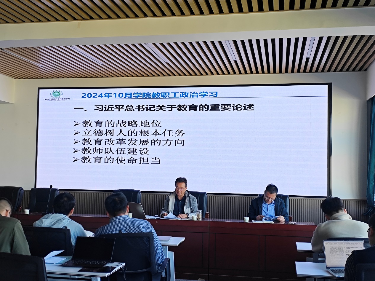 李文华副书记传达了学校近期有关会议精神,通报了学院重点工作进展及计划,并带领大家进行了政治学习。全院教师一起系统学习了习近平总书记关于教育的重要论述、2024年全国教育大会精神、《关于弘扬教育家精神加强新时代高素质专业化教师队伍建设的意见》,以及习近平总书记《论教育》等,进一步加强了老师们的政治素养和教育理念。